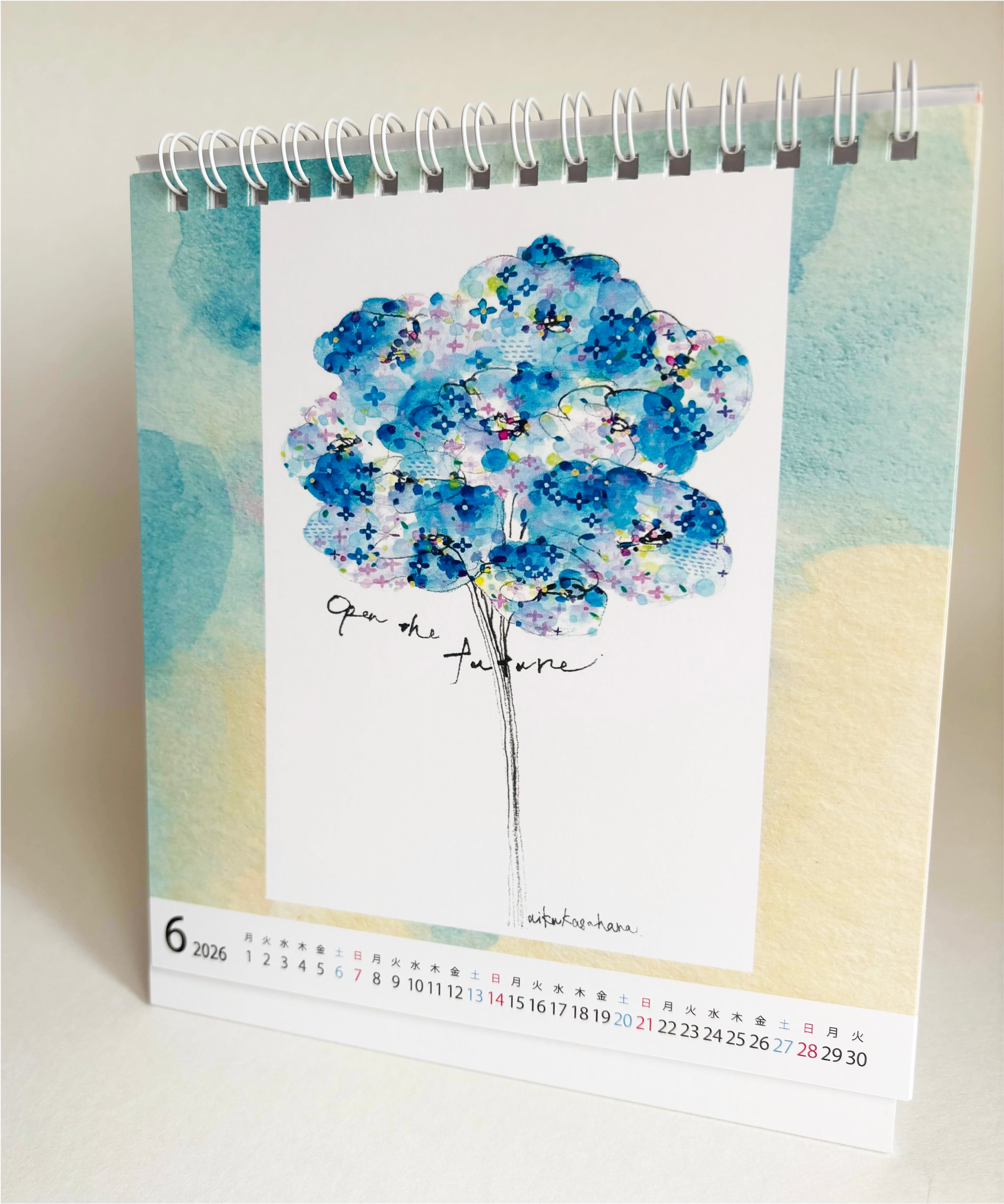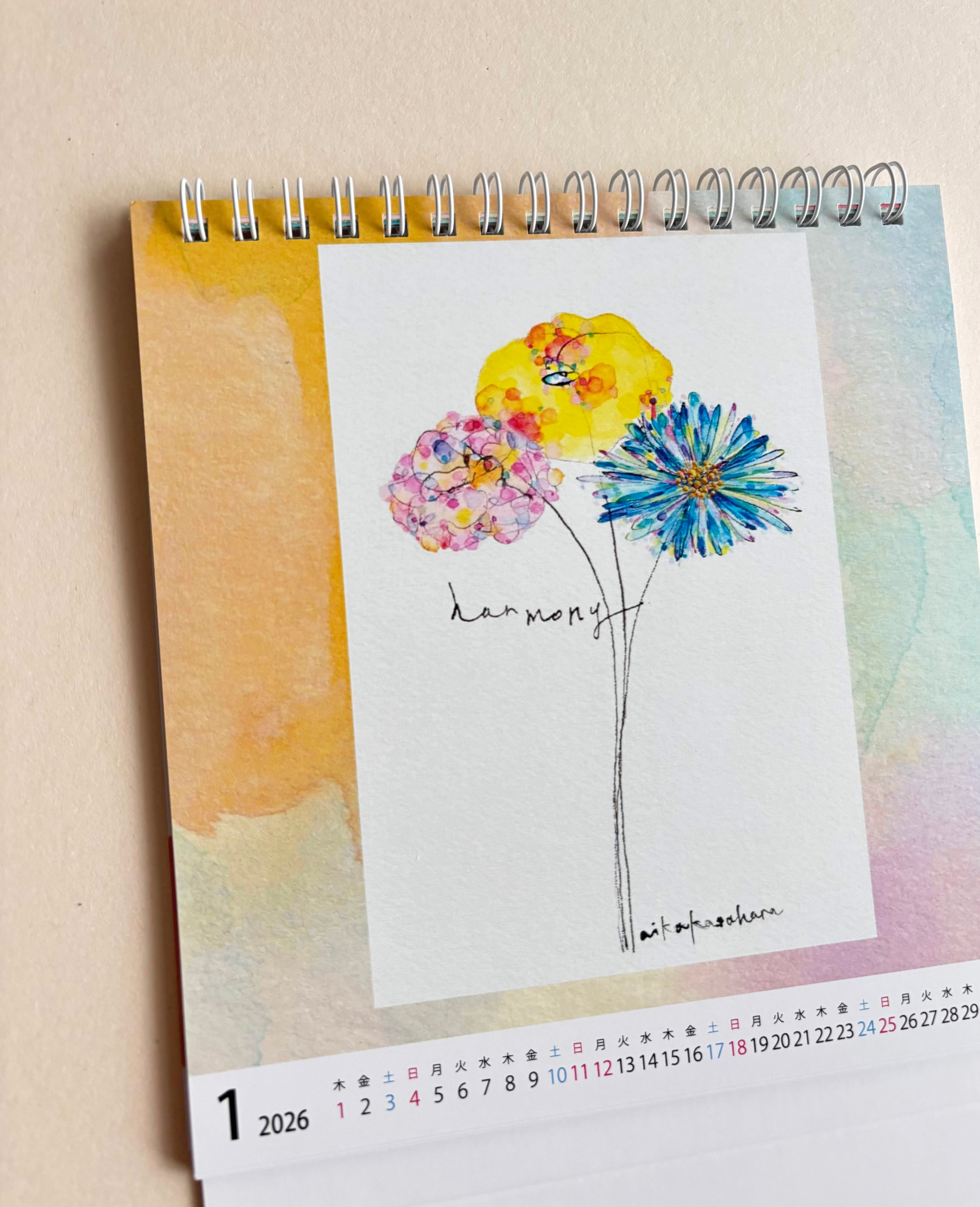 今年もカレンダーができました。この花は現実にある花ではなく、心の中に咲く花たちです。同じものを見たとしても、感じ方は人それぞれに異なるのではないでしょうか。また、時間と場所が違えば、感じ方が変わることもあるかもしれません。絵から自由に想像し、日々を彩り、このカレンダーが何かのお役に立てたとしたら嬉しいです。