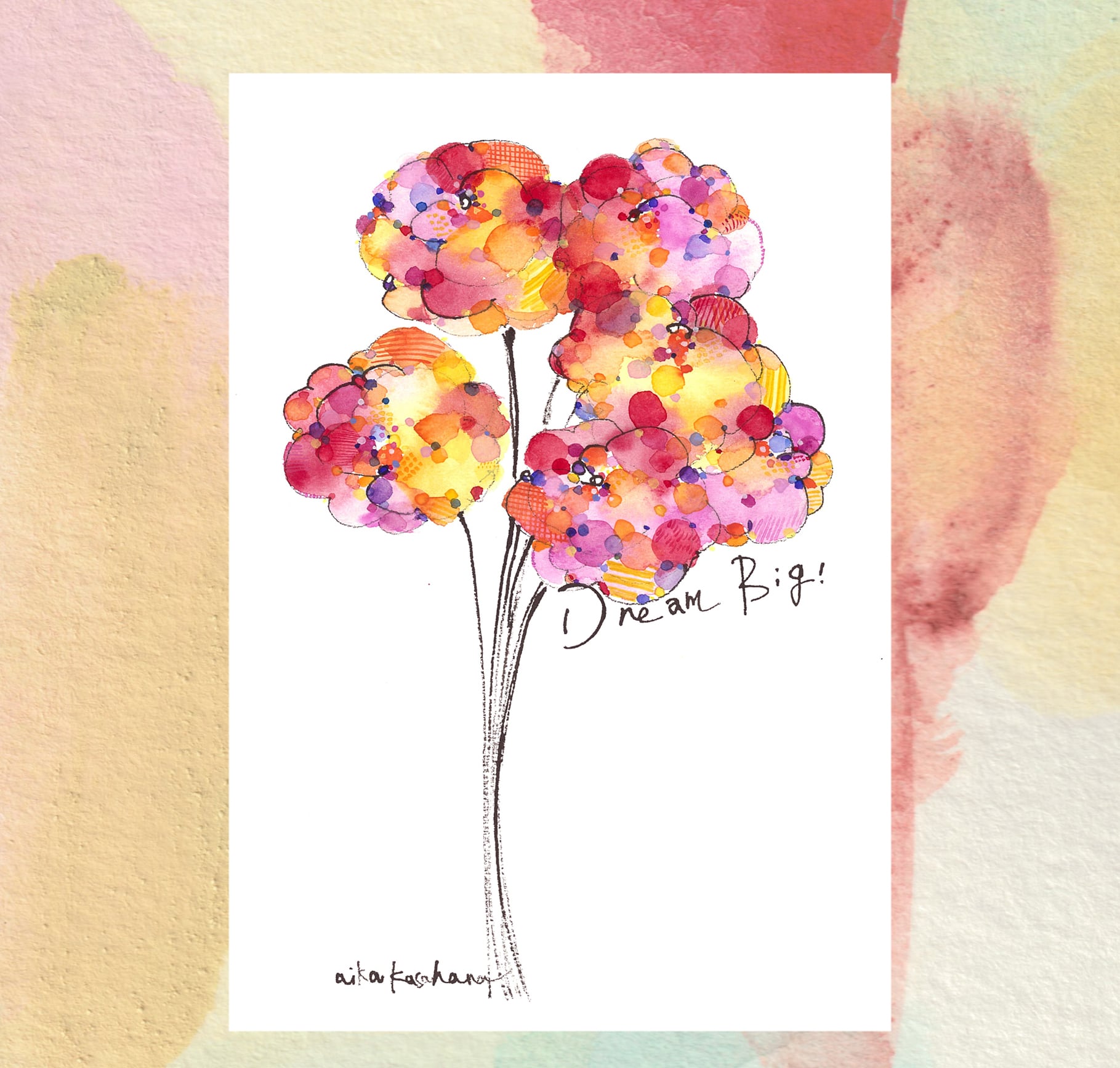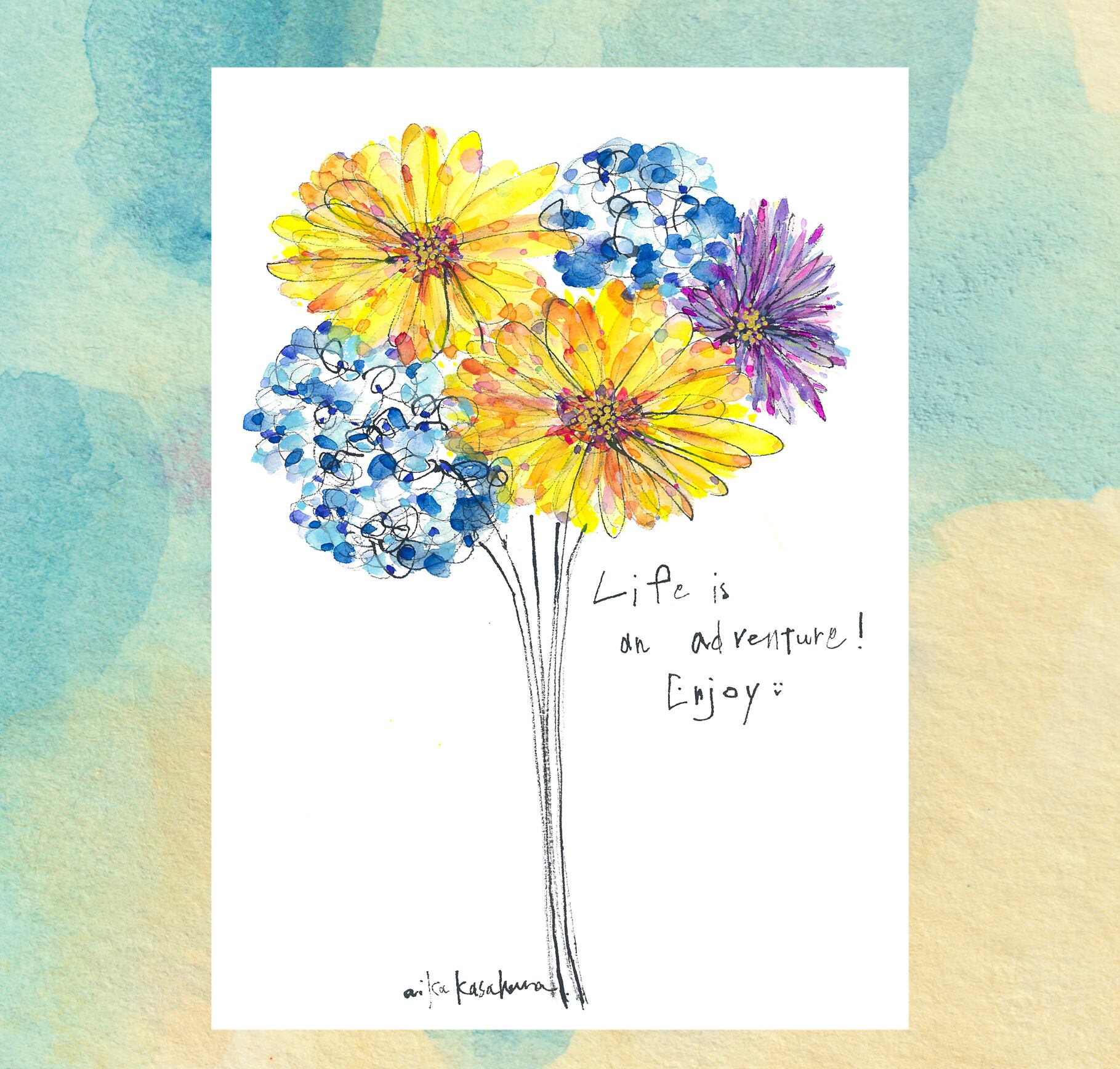 今年は、少しだけ趣向を変えてふんわりした色を絵の周りに入れてみました。絵と共に楽しんでいただけたら幸いです。
