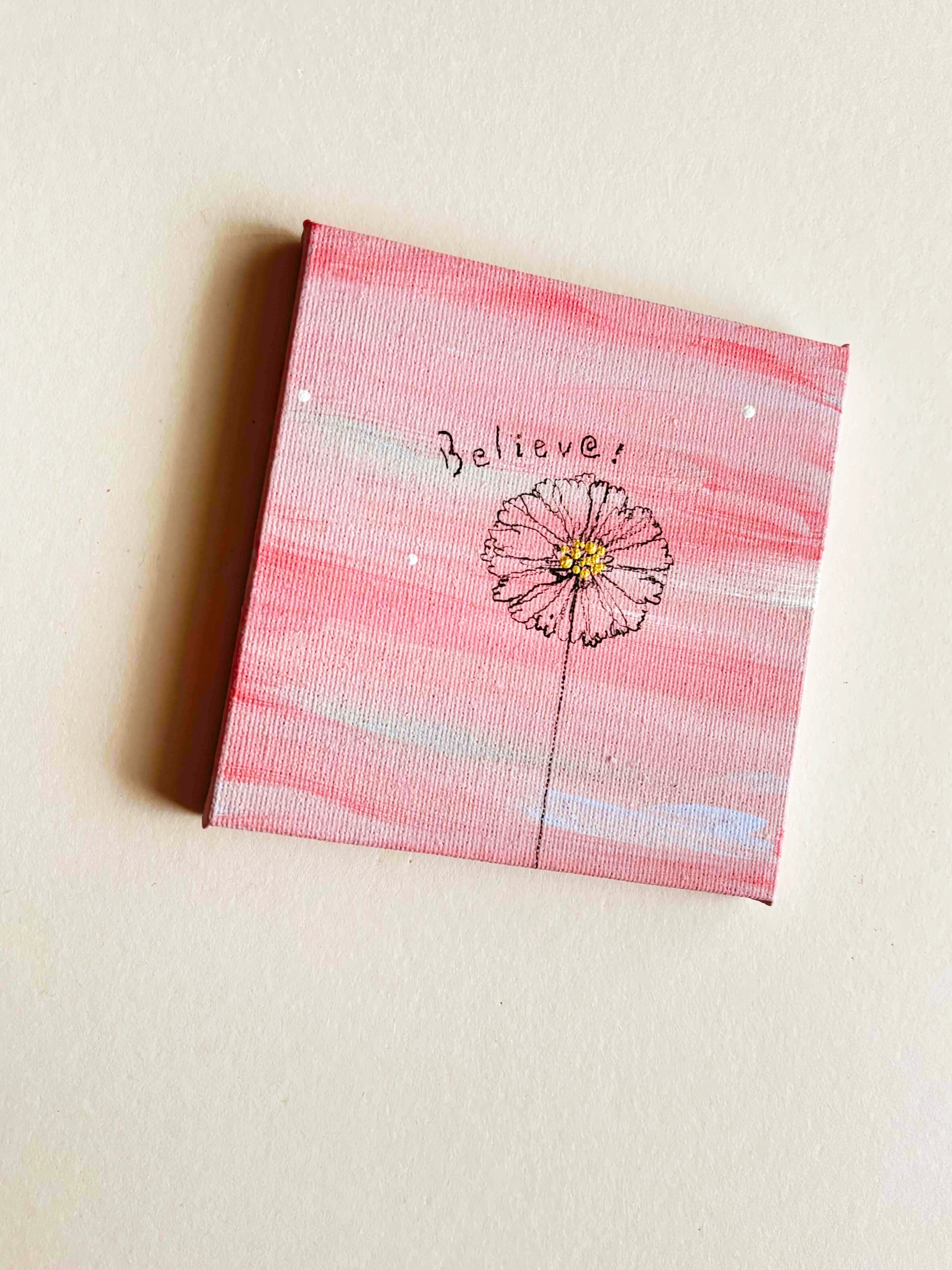 10cm×10cmキャンバス、厚み約1cm(キャンバスの表面だけでなく側面にも絵を描いてあります)